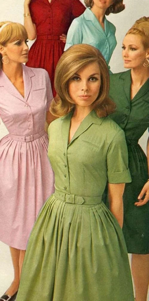 The Day Dress. A bit of a broad category as “day dresses” from the 1940’s - 1990’s didn’t evolve very much. Typically, they’re short sleeved, reaching tea-length, they often have pleats, buttoned fronts, or come with a matching belt. These dresses have simple silhouettes which make them easy to wear to work, running errands, or out to brunch - they are a great go-to casual piece.